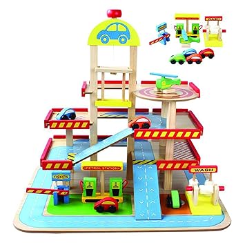 Tooky Toy Mehrstockige Spielzeug Garage Aus Holz Fur Kinder Inkl Parkschild Fahrrampen Und Tanksaulen Buntes Kinderspieleug Autogarage