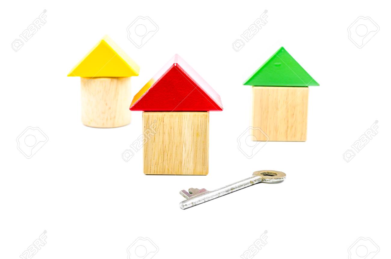 Spielzeug Holz Farbige Haus Mit Schlussel Auf Weissem