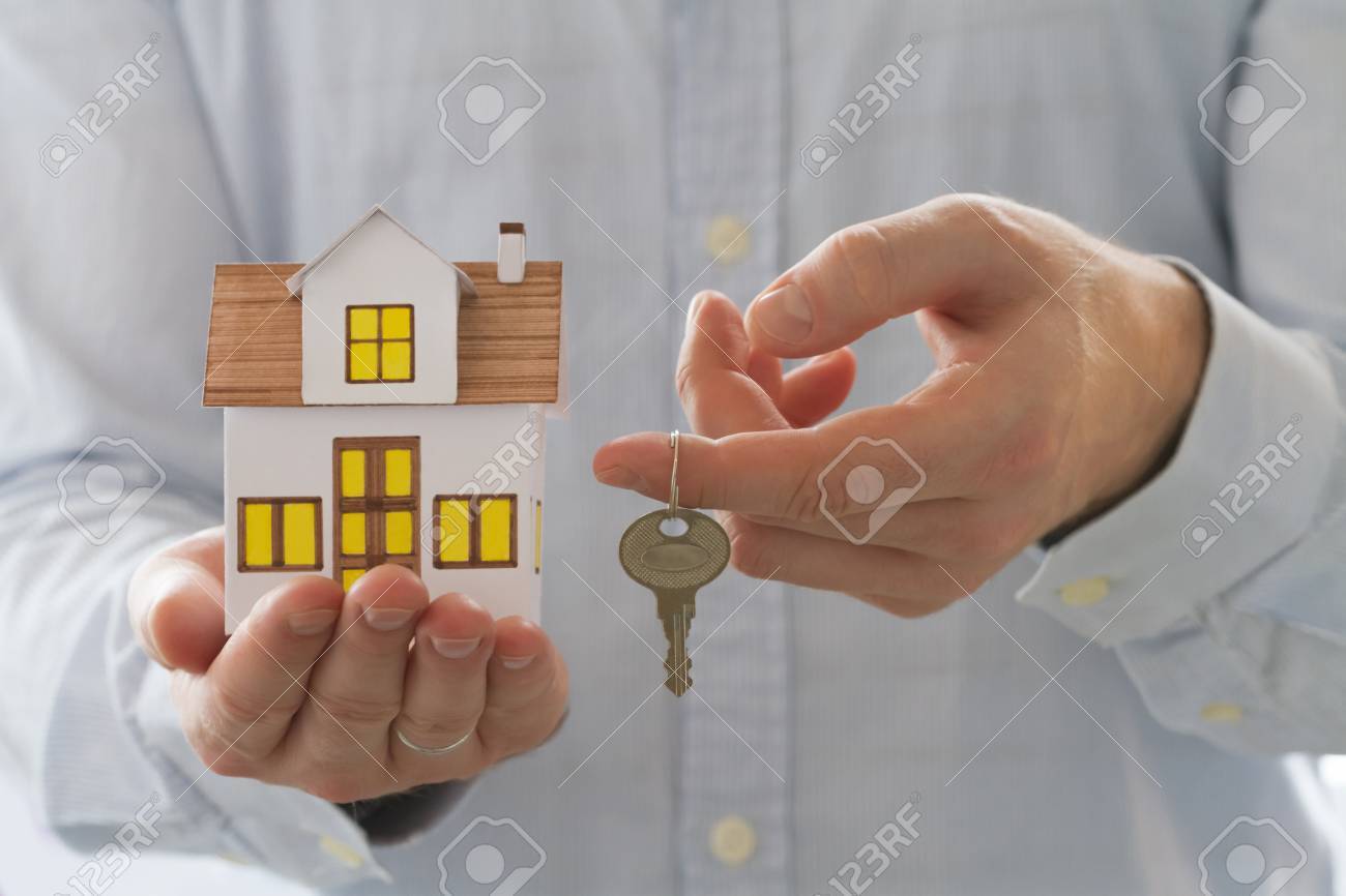 Geschaftsmann Halt Ein Spielzeug Haus Und Schlussel Notebook