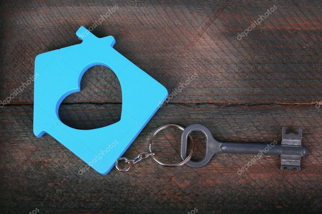 Spielzeug Haus Mit Schlussel Auf Holzernen Hintergrund
