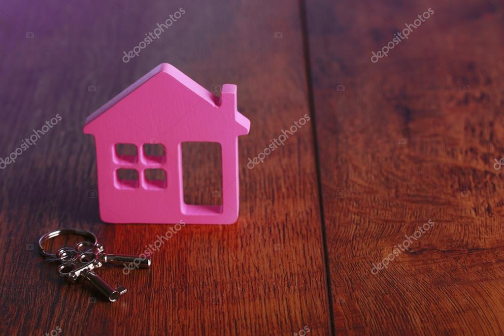 Spielzeug Haus Mit Schlussel Auf Holz Hintergrund Stockfoto