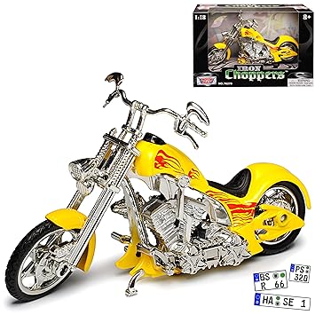 Motormax Iron Choopers Gelb Flammen Custom Chopper 1 18 Modell Motorrad Mit Individiuellem Wunschkennzeichen