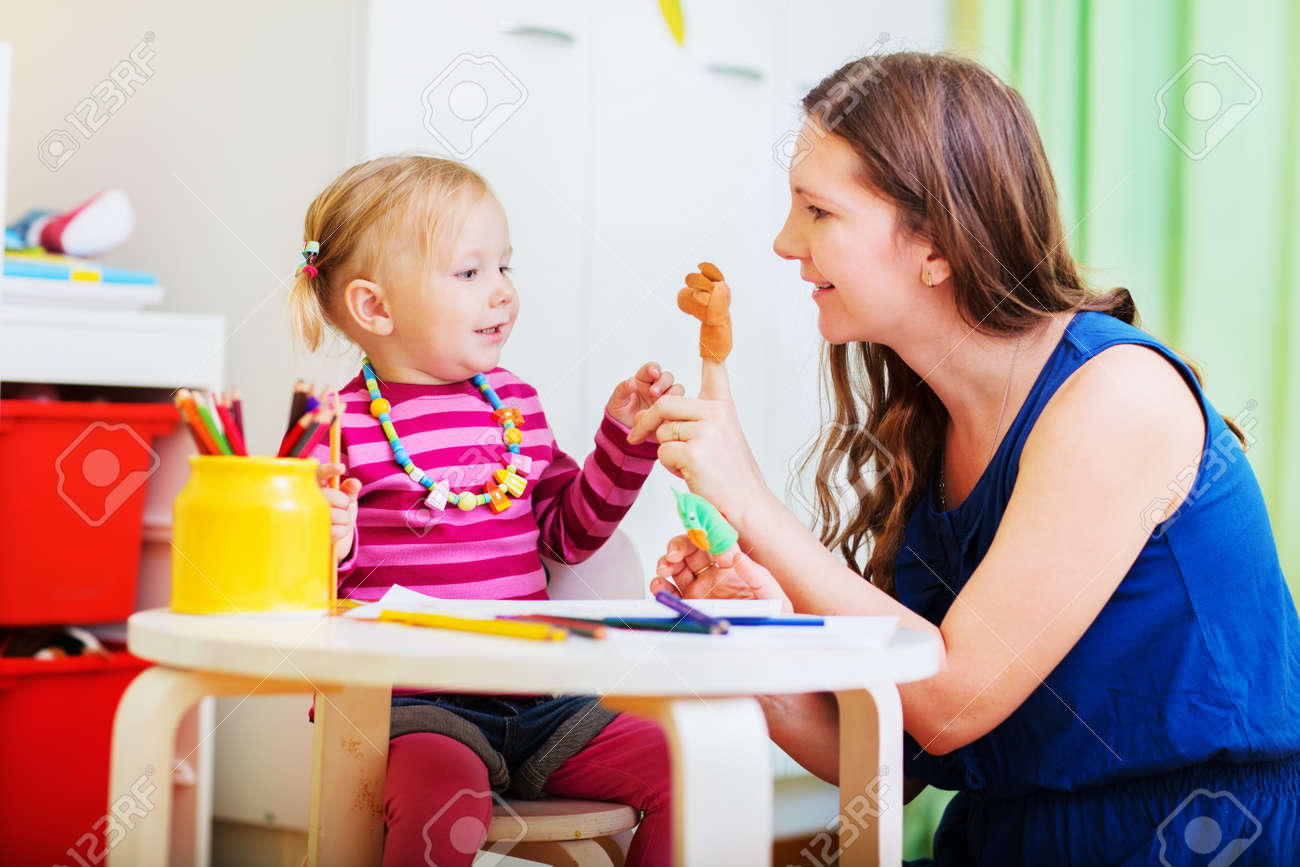 Niedlichen Kindergartnerin Und Kind Kleinkind Junge Spielt