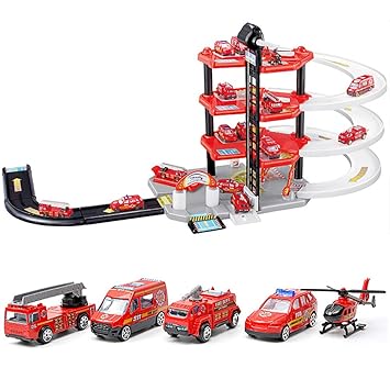 Nuheby Parkgarage Parkhaus Mit Aufbewahrungsbox Garage Spielzeug Feuerwehr Auto Hubschrauber Set Kleinkinderspielzeug Fur Kinder Ab 3 4 5 6 Jahre