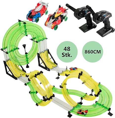 Costway Autorennbahn Mit 2 Spielzeugautos Rennstrecke Fur Kinder Ab 6 Jahren Rennbahn Mit Magnet Double Track Car Set Grun